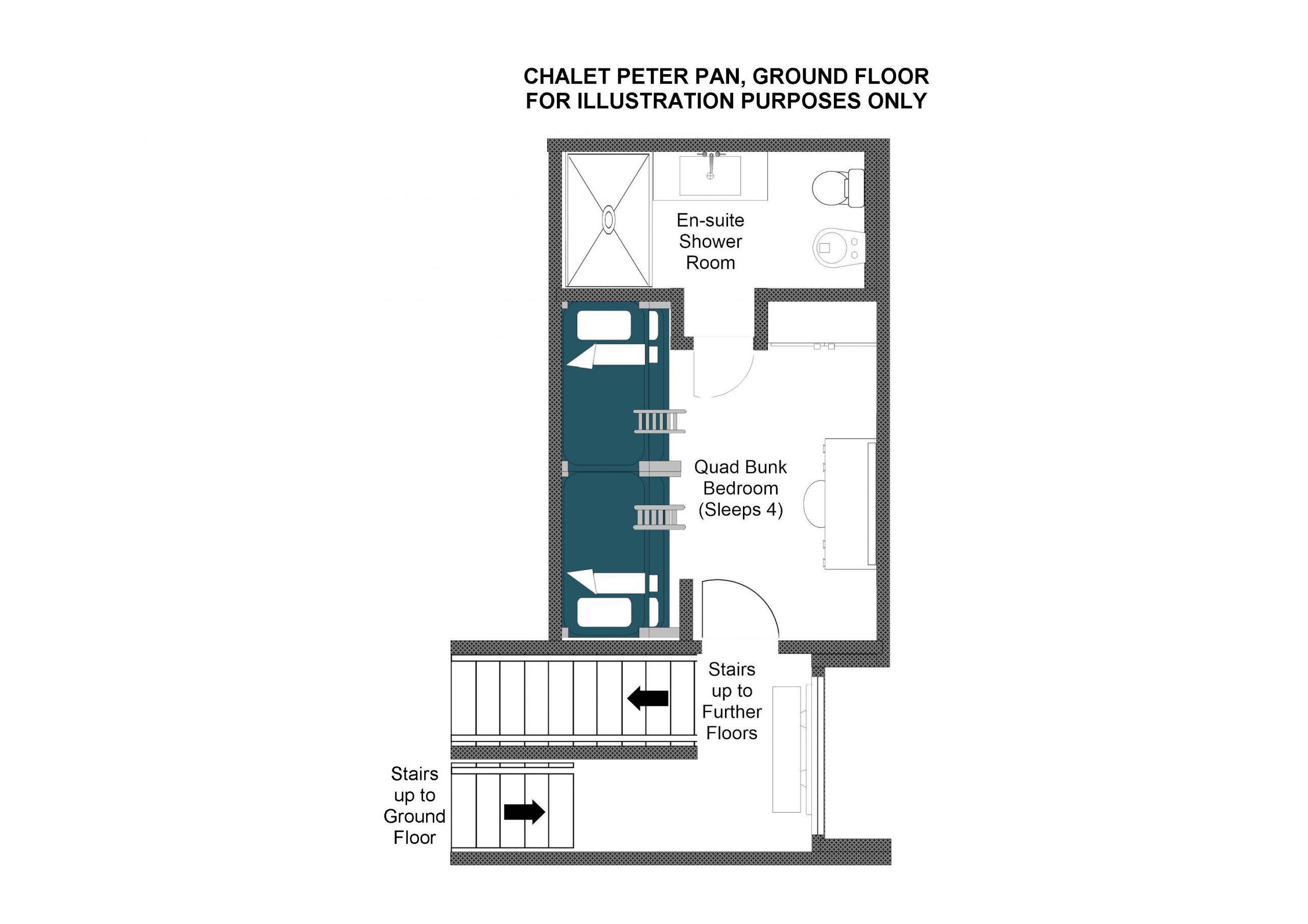 Moving downstairs there is an enchanting quad bunk room, the ideal bedroom for children, with en-suite bathroom. The custom-built bunk beds with traditional wood finish give the cosy, alpine feel you would hope for from a children’s bedroom.